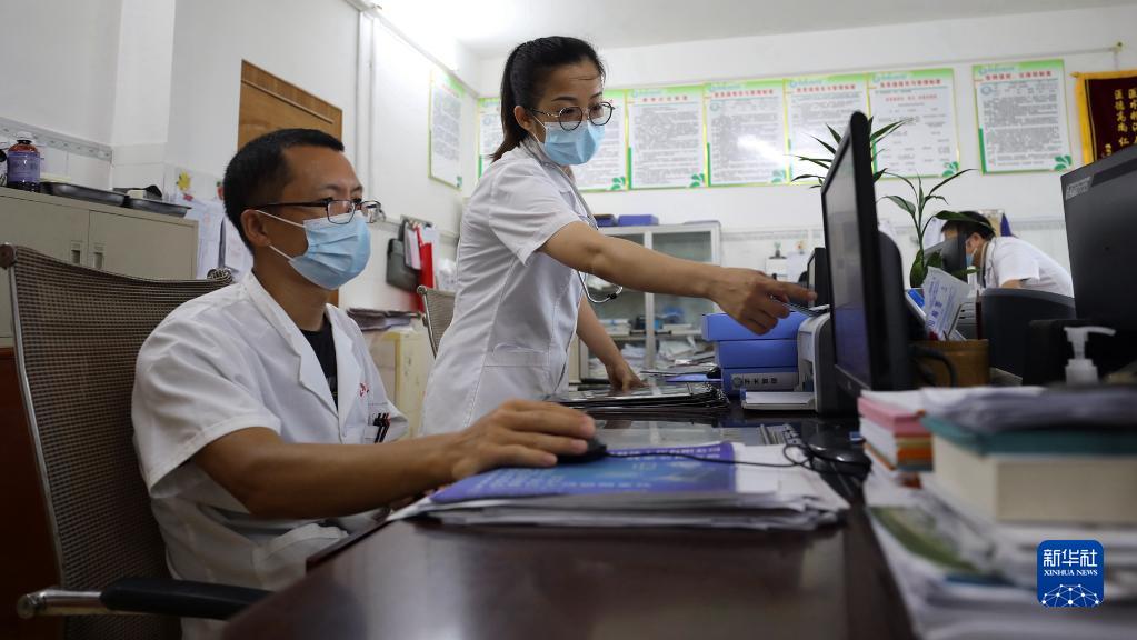 李秋菊(右)和同事討論病人的治療方案(8月17日攝)。