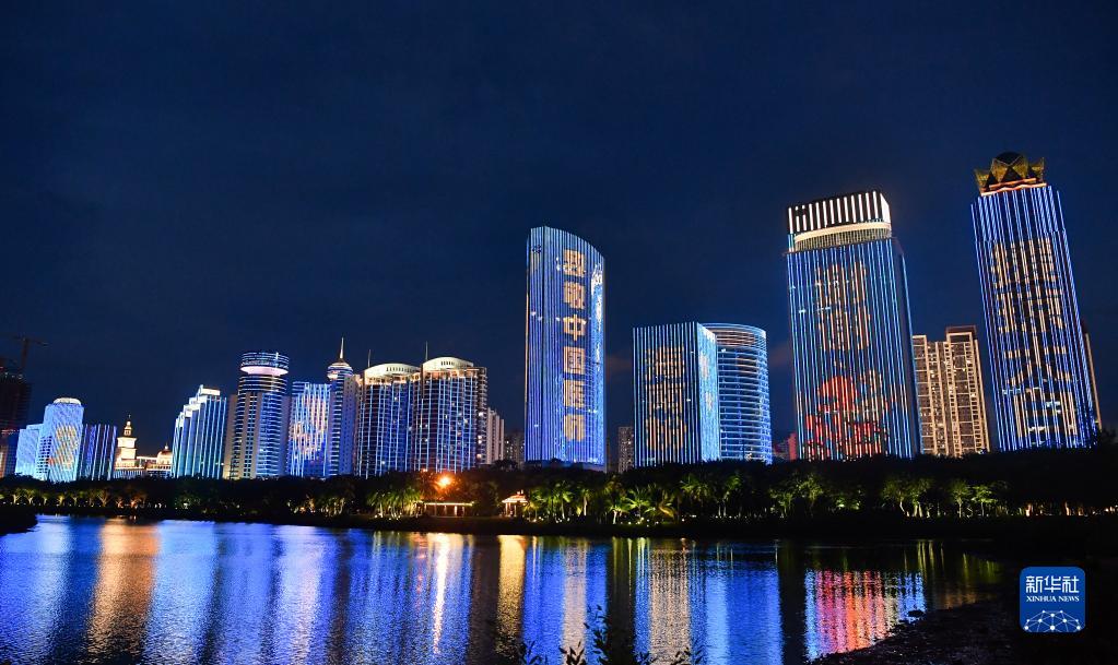 當日是第五個(gè)中國醫師節,??谑薪M織開(kāi)展中國醫師節主題燈光秀,向醫務(wù)人員致敬。
