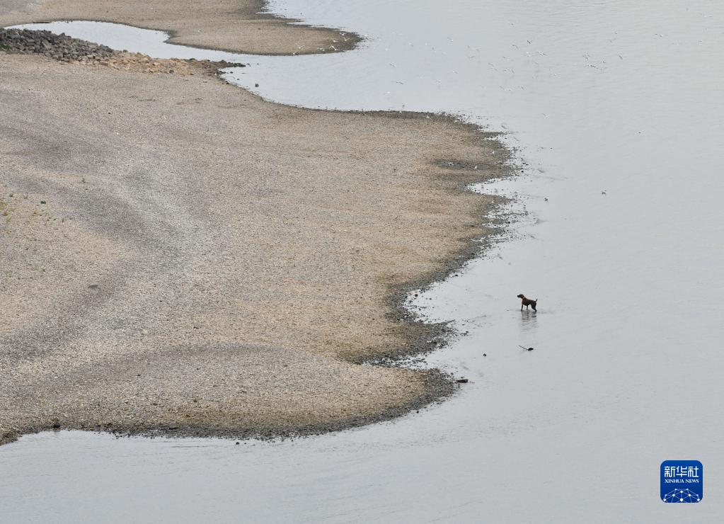 8月17日,在德國北威州杜塞爾多夫,一只小狗在萊茵河畔玩耍。