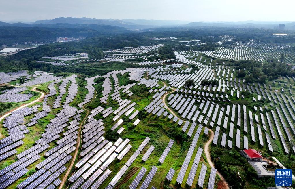 空中俯瞰陜西洛南的“光伏農場(chǎng)”(8月19日攝,無(wú)人機照片)。