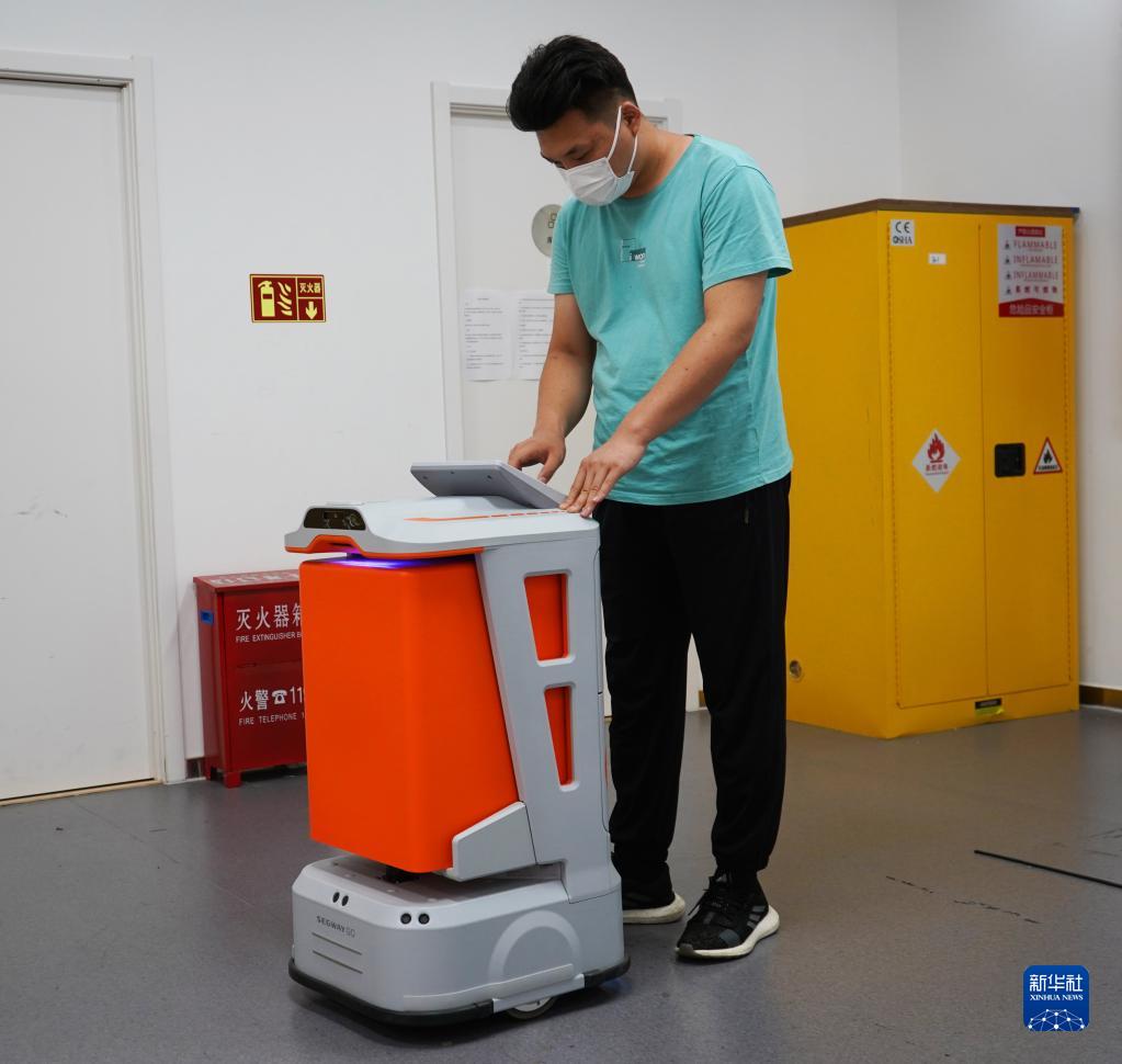 在北京市海淀區中關(guān)村東升科技園,一家商用機器人公司的工作人員在實(shí)驗室調試配送機器人(2022年6月22日攝)。