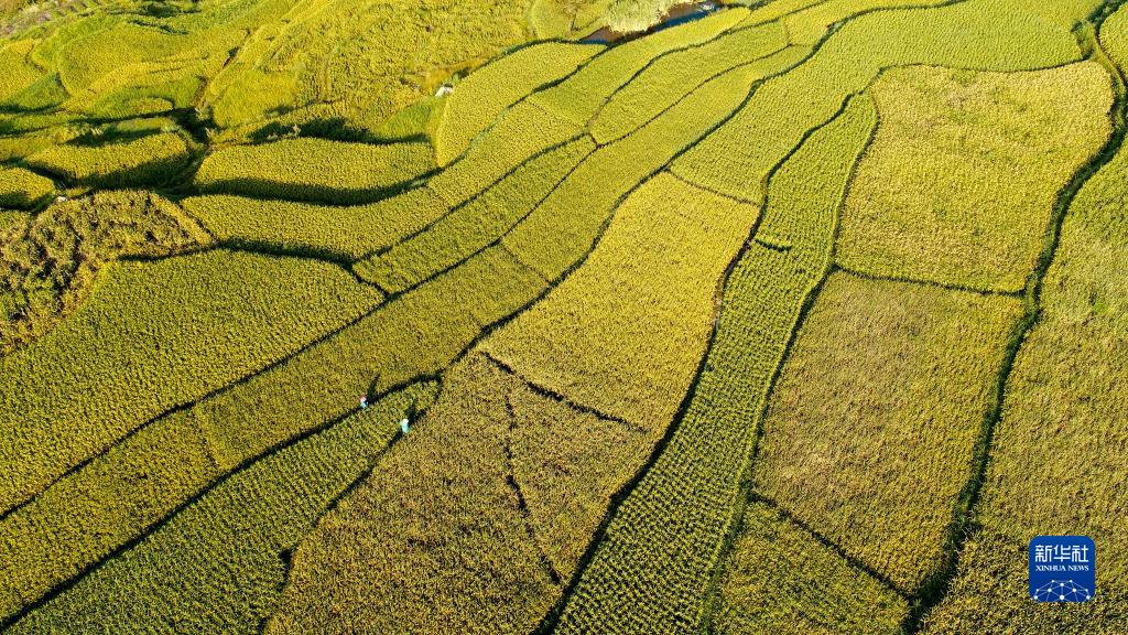 8月20日,貴州省丹寨縣高要村的村民走在稻田里(無(wú)人機照片)。
