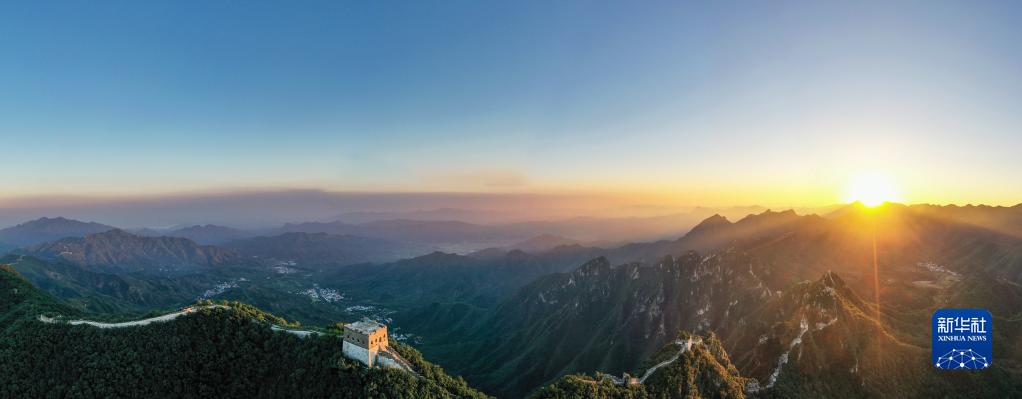 這是8月16日拍攝的夕陽(yáng)下的箭扣長(cháng)城(無(wú)人機全景照片)。
