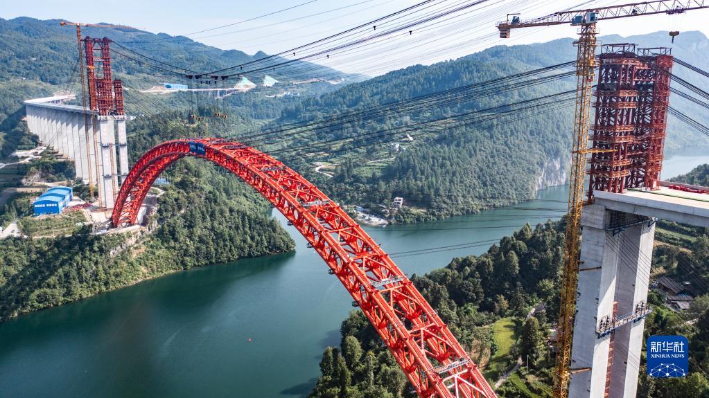 8月15日拍攝的德余高速烏江特大橋合龍現場(chǎng)(無(wú)人機照片)。