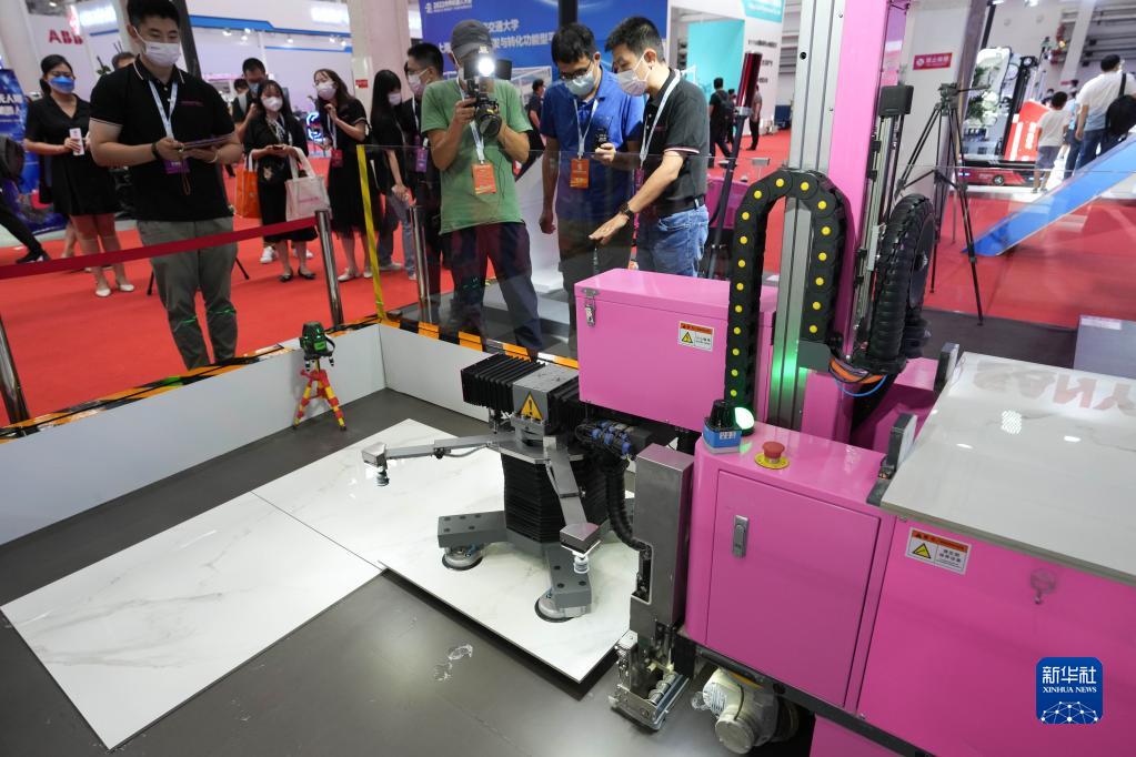 這是在2022世界機器人博覽會(huì )“機器人+建筑”區域展示的一款地磚鋪貼機器人(8月19日攝)。