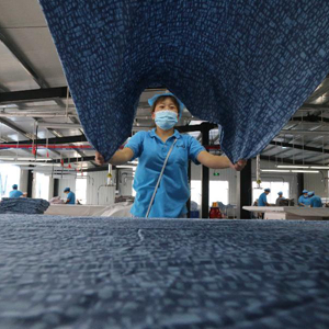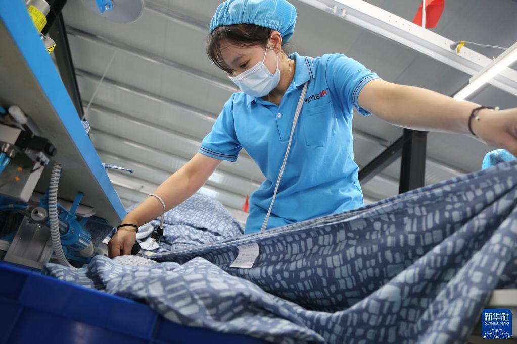 8月21日,濱州市惠民縣一家紡公司工人在趕制床上用品。