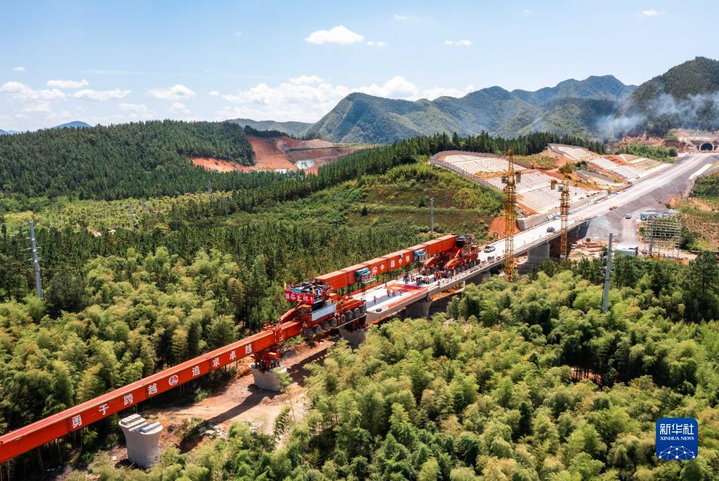 這是宣績(jì)鐵路站前二標首孔箱梁架設現場(chǎng)(8月21日攝,無(wú)人機照片)。
