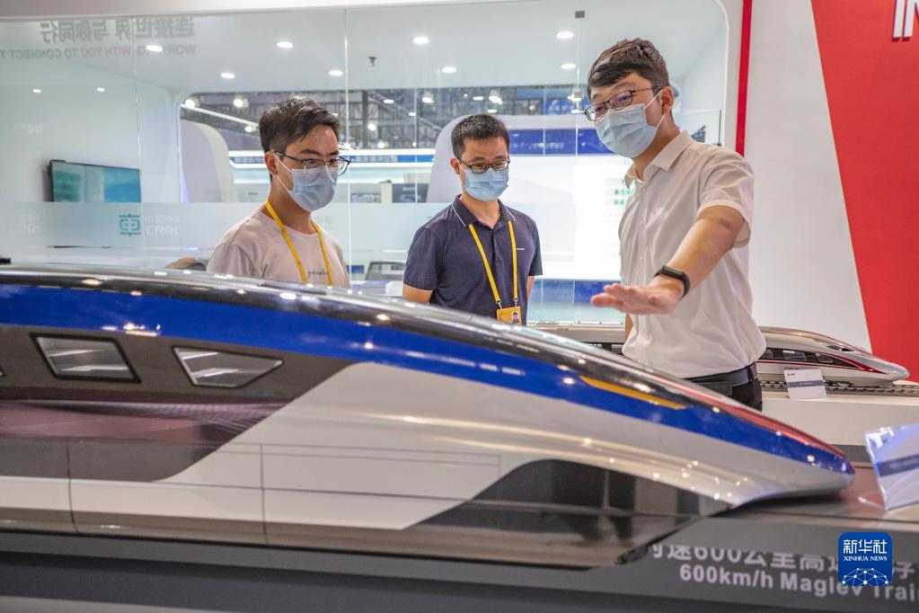 8月22日,在2022智博會(huì )中國中車(chē)展廳,工作人員(右)向嘉賓介紹時(shí)速600公里高速磁懸浮交通系統。