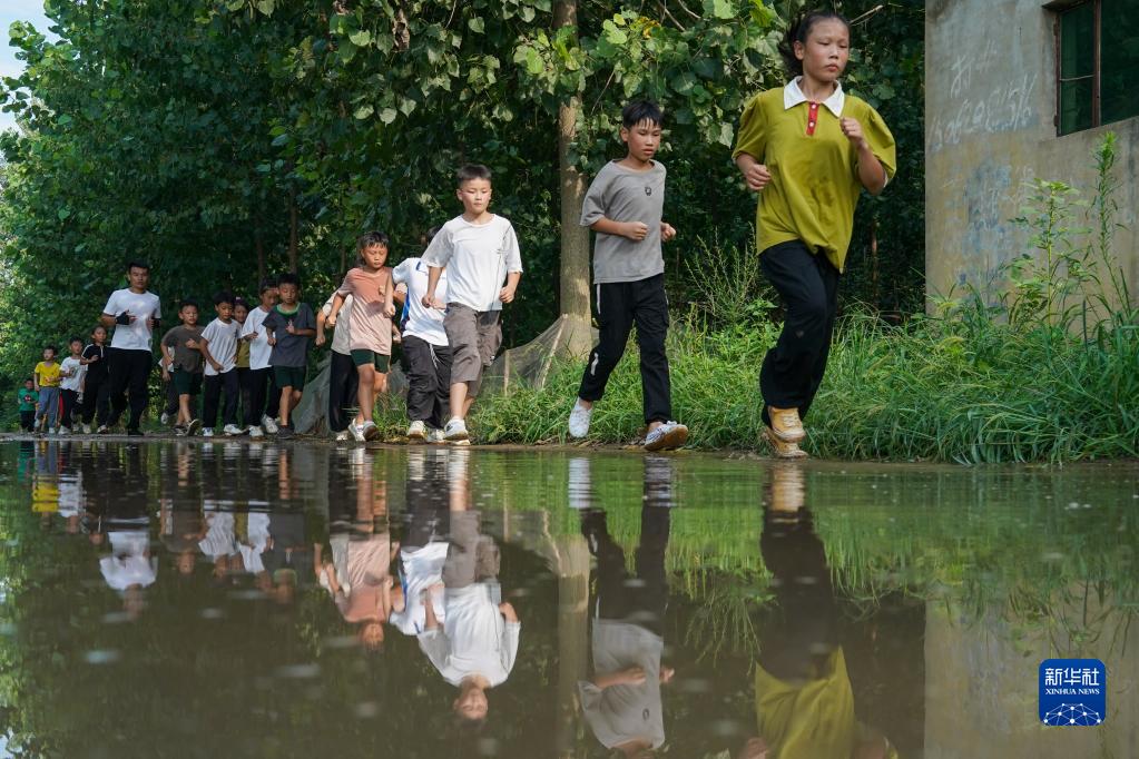 劉龍帶領(lǐng)孩子們在鄉間小路跑步,進(jìn)行體能訓練(8月16日攝)。