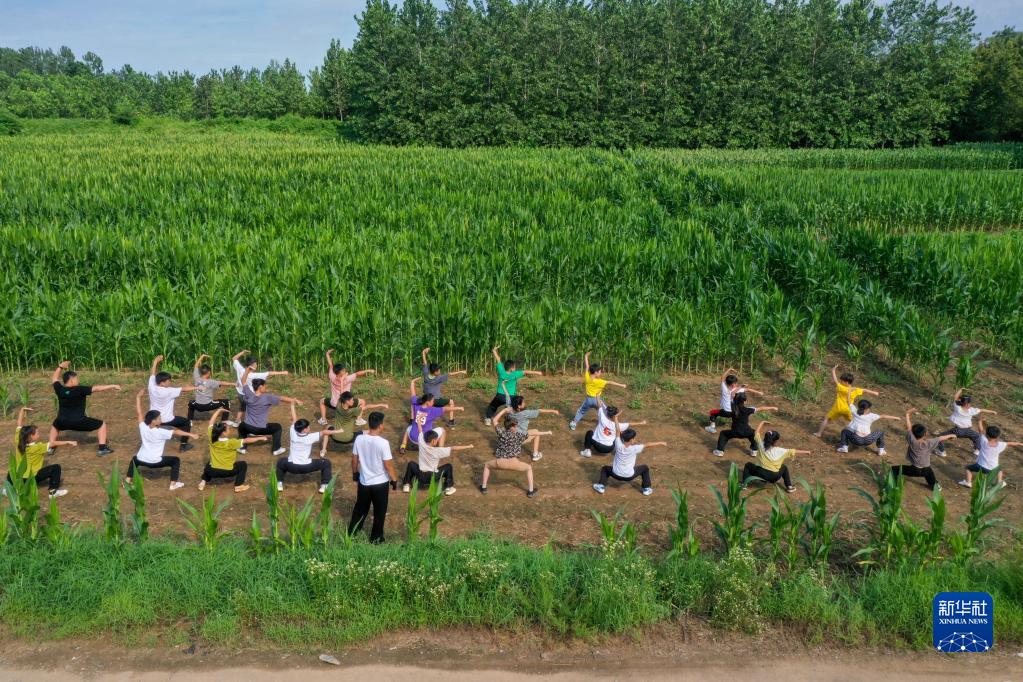 劉龍(前)帶領(lǐng)孩子們在農田里練武術(shù)(無(wú)人機照片,8月16日攝)。