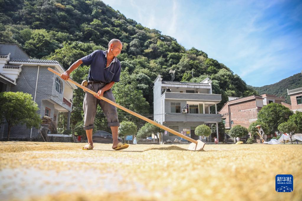 8月23日,湖南省永州市藍山縣祠堂圩鎮虎溪村村民在晾曬稻谷。