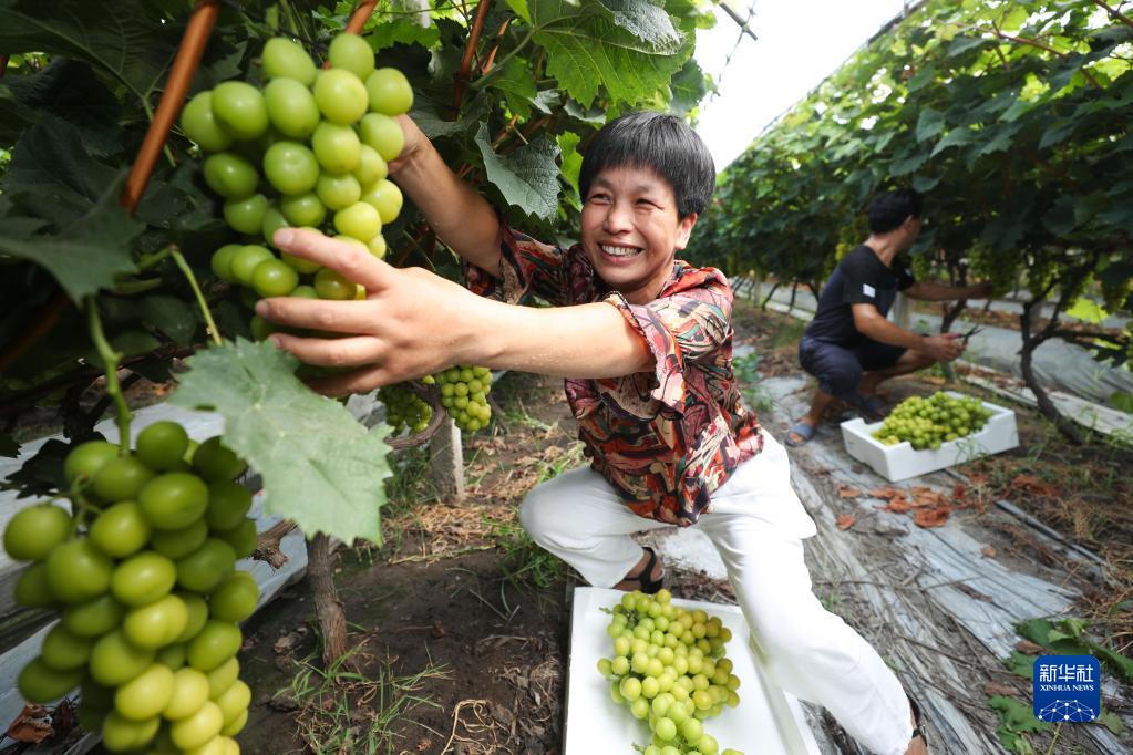 8月23日,在浙江省湖州市德清縣洛舍鎮三家村,果農在采收葡萄。