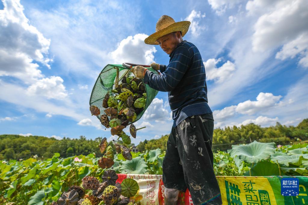8月23日,湖南省常寧市柏坊鎮新柏村農民在采收蓮蓬。