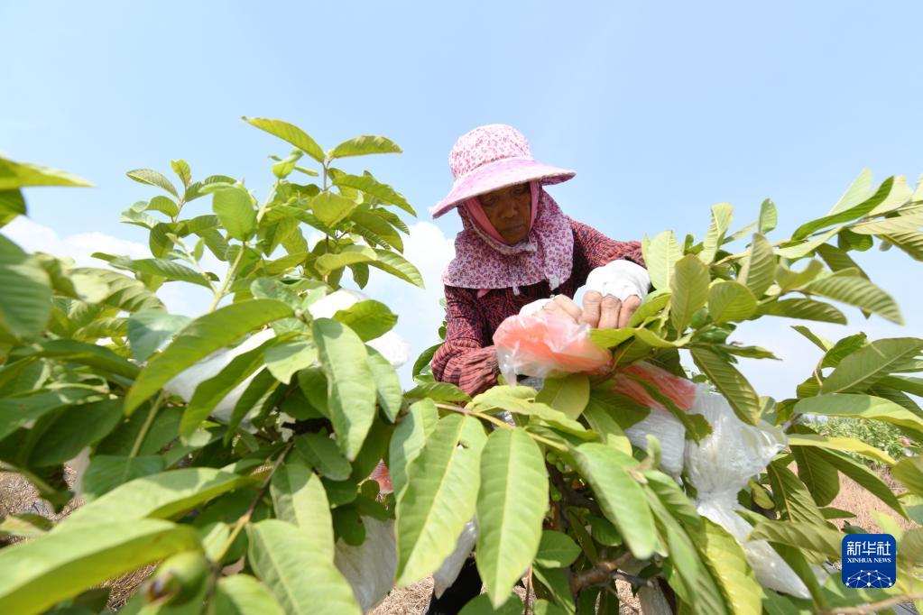 8月23日,在福建省福清市??阪傖荡宓囊惶庌r場(chǎng),果農忙著(zhù)疏果、套袋。