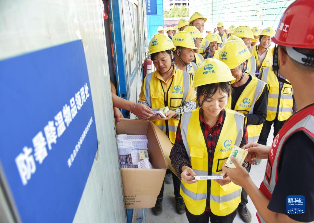 8月23日,青島自貿全球消費綜合體項目部的工作人員為建設者發(fā)放防暑藥品。