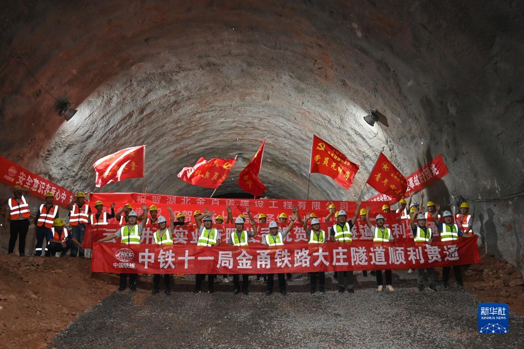 8月25日,中鐵十一局工作人員在金甬鐵路大莊隧道慶祝順利貫通。
