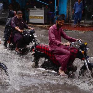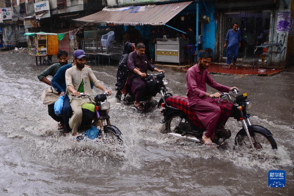8月23日,在巴基斯坦海得拉巴,人們在積水路段騎行。