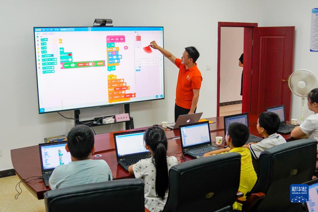 8月24日,在重慶豐都縣高家鎮汶溪社區黨群服務(wù)中心內,一名家庭教育互助會(huì )的志愿者在為學(xué)生上機器人編程課。