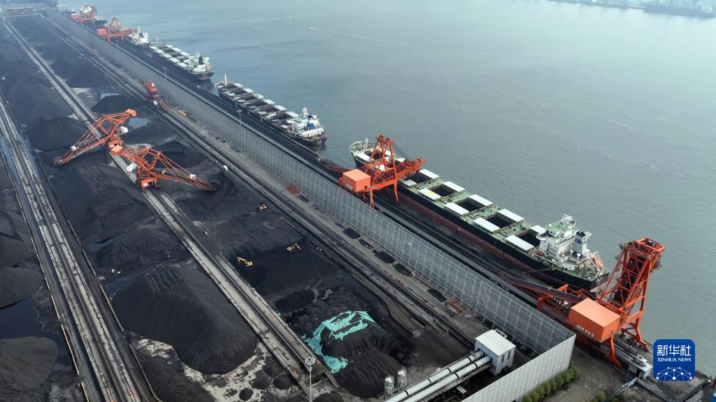 8月25日,在唐山港曹妃甸港區,裝船機在進(jìn)行煤炭裝船作業(yè)(無(wú)人機照片)。