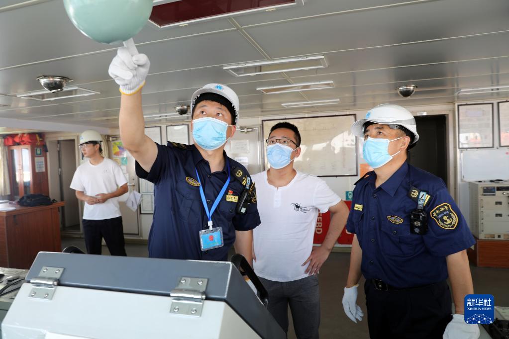 8月25日,在唐山港曹妃甸港區,曹妃甸海事局執法人員在檢查船舶航行設備。