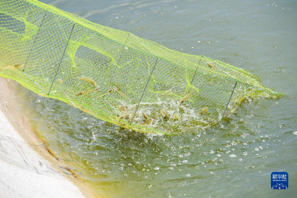 8月25日,鹽堿水對蝦養殖園區工作人員在捕撈對蝦。