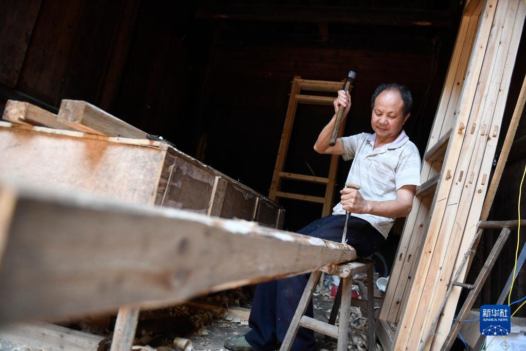 在浙江省松陽(yáng)縣三都鄉楊家堂村,負責修復一古民居的工匠在制作木門(mén)(2018年5月25日攝)。新華社記者 黃宗治 攝