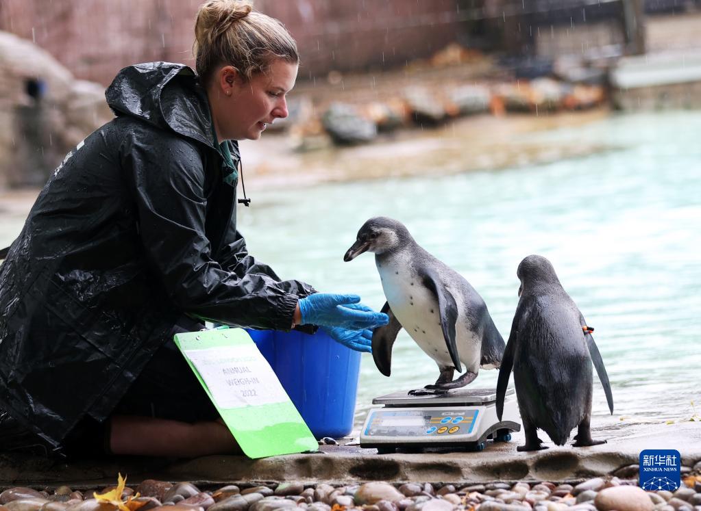8月25日,在英國倫敦動(dòng)物園,工作人員為企鵝稱(chēng)重。
