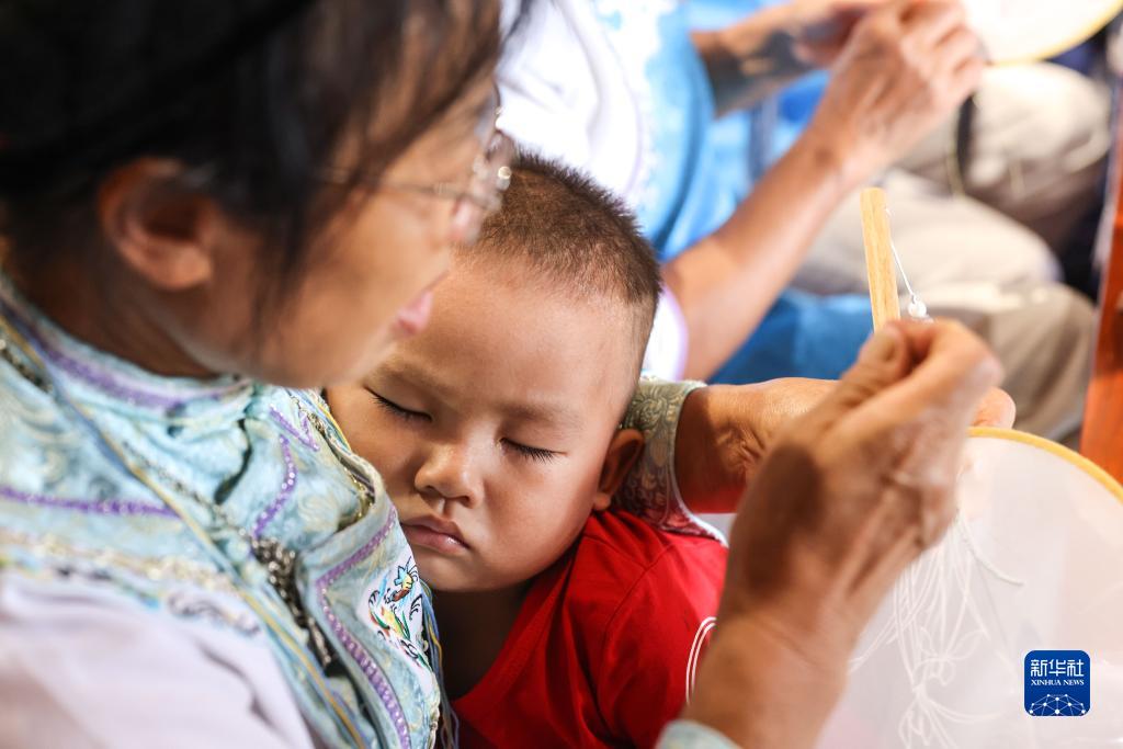8月26日,貴陽(yáng)市花溪區青巖鎮山王廟村一名懷抱孩子的婦女在刺繡扇面。