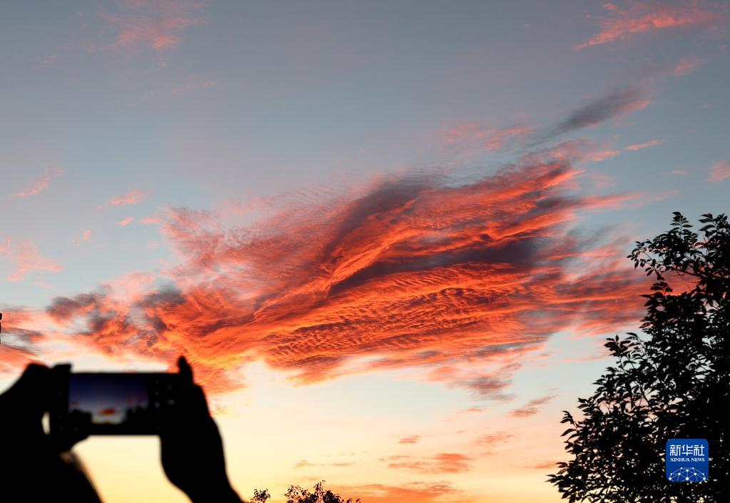 8月26日,一位準備夜游八達嶺長(cháng)城的游客拍攝落日彩云。
