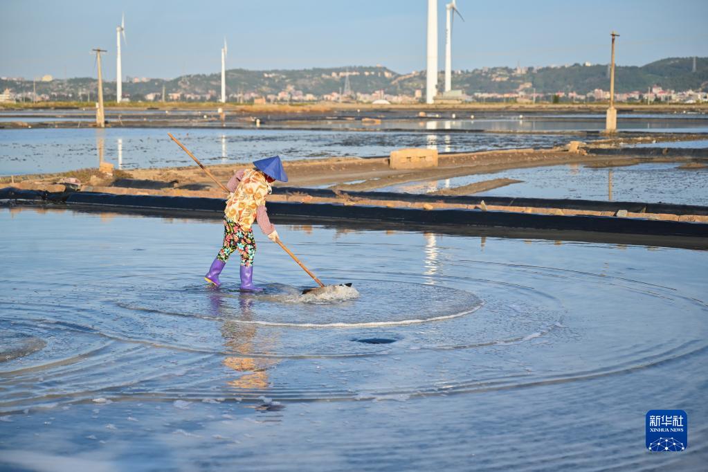 8月26日,在福建省莆田市秀嶼區東嶠鎮的莆田鹽場(chǎng),工人在鹽田里扒鹽。