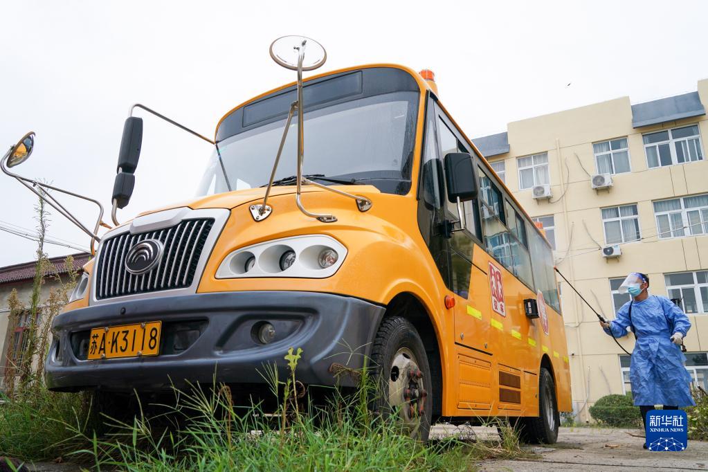 8月27日,工作人員在南京市高淳區固城中學(xué)對校車(chē)進(jìn)行消殺。