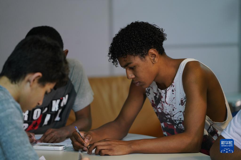 8月25日,在巴西里約熱內盧西區“上帝之城”社區,馬西奧(右)和同學(xué)們在“彈奏聲音”教室中上課。新華社記者 王天聰 攝