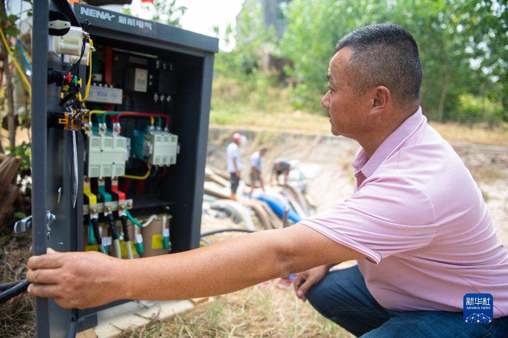 8月25日,在湖南省常德市安鄉縣三岔河鎮羅洲電排,三岔河鎮水利管理站的周剛在檢查配電箱。