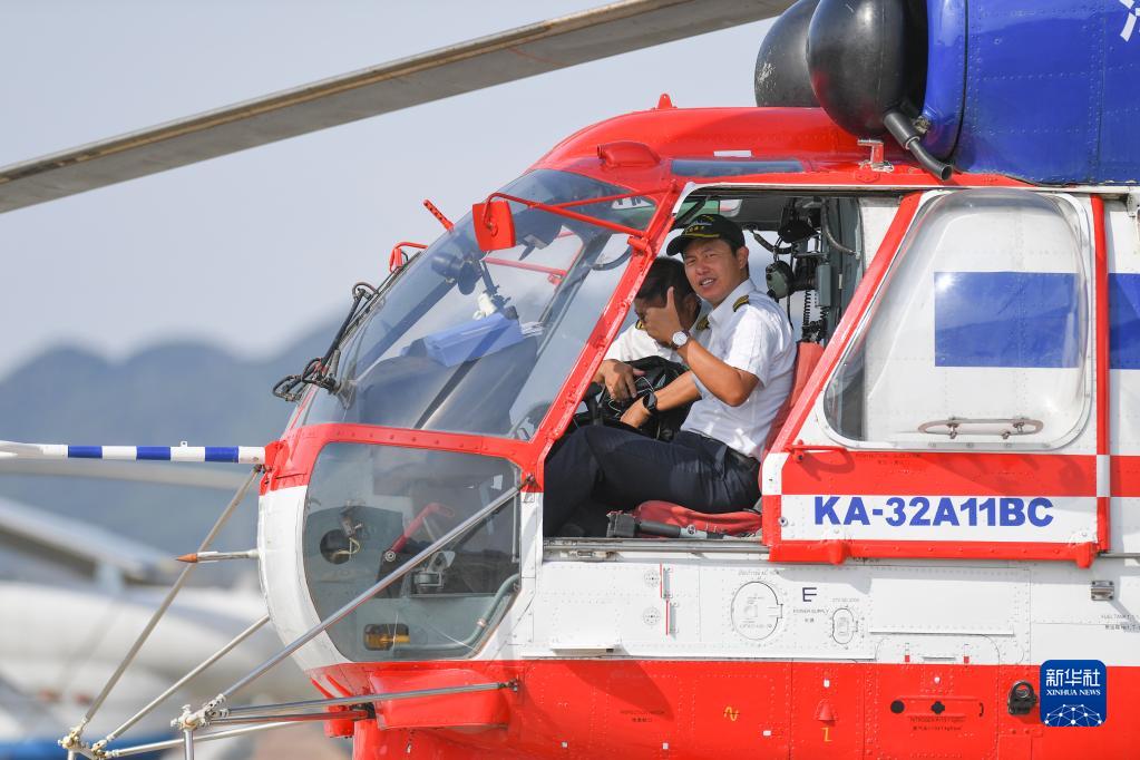 8月28日,在重慶龍興通用機場(chǎng),來(lái)自四川廣安的救援直升機機長(cháng)在準備起飛前向送行人員示意。