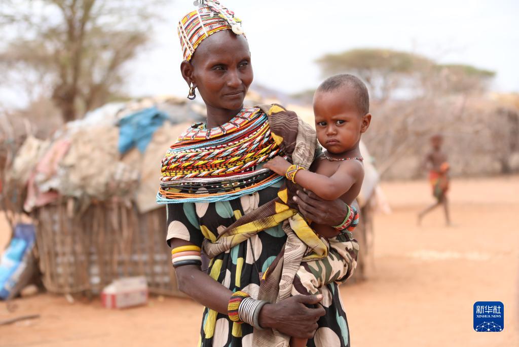 8月26日,一名女子抱著(zhù)孩子站在肯尼亞馬薩比特郡萊薩米斯鎮一干旱的村莊內。