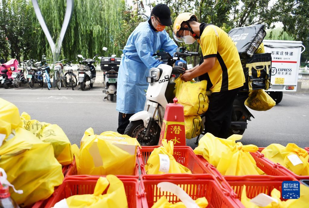 8月30日,在石家莊市裕華區一家超市保供點(diǎn),外賣(mài)人員在打包,準備為市民送貨。