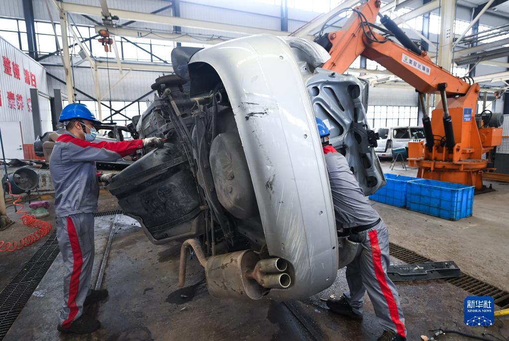 8月30日,在湖州市吳興區東林鎮一家機動(dòng)車(chē)回收拆解企業(yè)的車(chē)間內,工作人員在流水線(xiàn)上拆解機動(dòng)車(chē)的底盤(pán)。