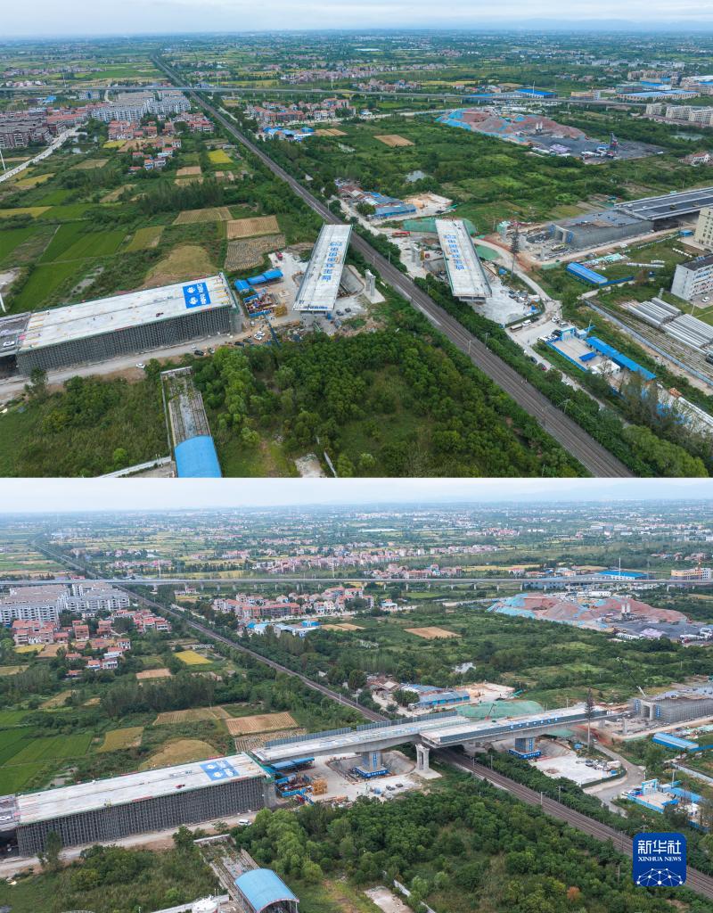 拼版照片:上圖為8月30日拍攝的湖北孝感兩座萬(wàn)噸橋梁轉體“跨越”京廣鐵路施工場(chǎng)景。下圖為8月30日拍攝的成功轉體后的跨京廣鐵路橋梁(無(wú)人機照片)。