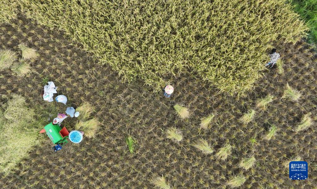 8月30日,村民在羅甸縣沫陽(yáng)鎮紅星村收割稻谷(無(wú)人機照片)。
