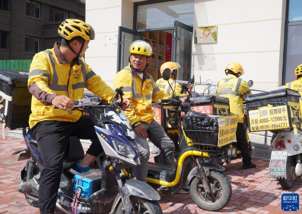 8月31日,在單縣園藝街道黃樓社區“暖新驛站”門(mén)口,外賣(mài)配送員休息后準備出發(fā)工作。