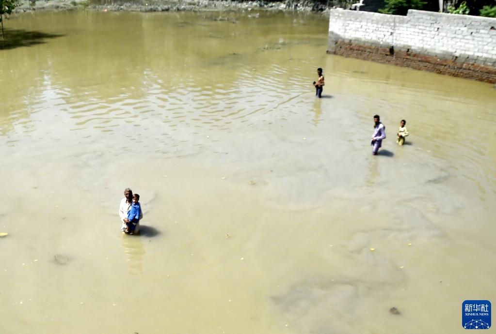 8月31日,在巴基斯坦西北部開(kāi)伯爾-普什圖省的賈爾瑟達地區,人們走在洪水中。
