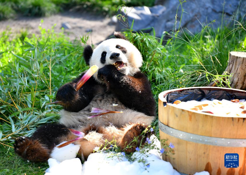 8月31日,在德國柏林動(dòng)物園,大熊貓“夢(mèng)想”享用“生日桶”。