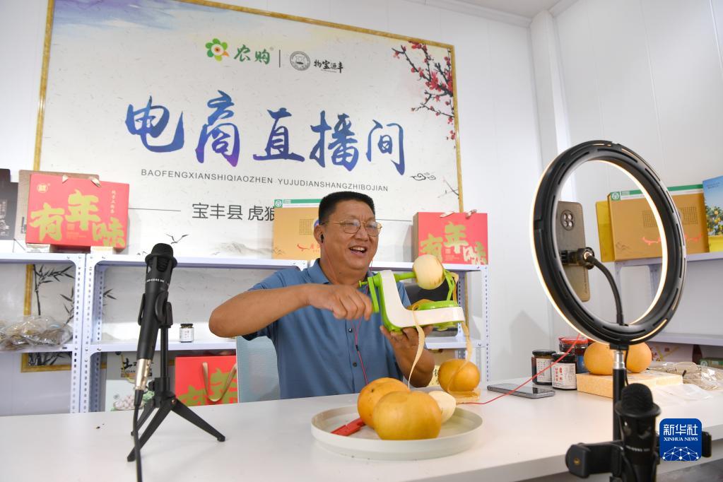 8月31日,寶豐縣欣榮種植專(zhuān)業(yè)合作社的社員在直播間展示收獲的梨果產(chǎn)品。