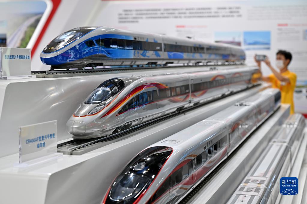9月1日,觀(guān)眾在國家會(huì )議中心內的國鐵集團展臺拍攝智能動(dòng)車(chē)組模型。