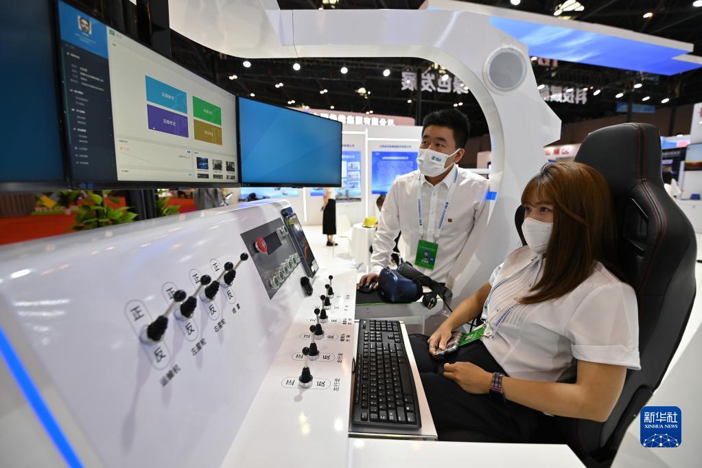 9月1日,參展商在博覽會(huì )現場(chǎng)介紹掘進(jìn)機仿真培訓實(shí)操體驗一體機。