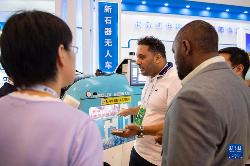 9月1日,一名參展商在博覽會(huì )上向其他展位的工作人員了解一款無(wú)人車(chē)產(chǎn)品。