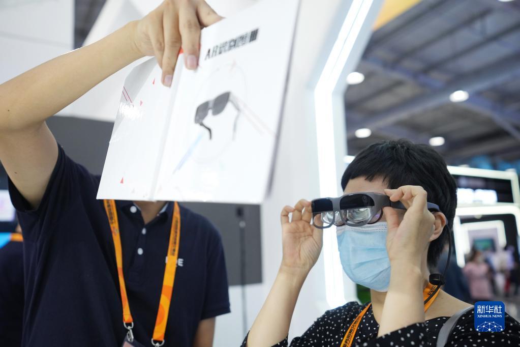 9月1日,在服貿會(huì )首鋼園展區電信、計算機和信息服務(wù)專(zhuān)題展館,參觀(guān)者體驗一款增強現實(shí)(AR)眼鏡產(chǎn)品。新華社記者 鞠煥宗 攝