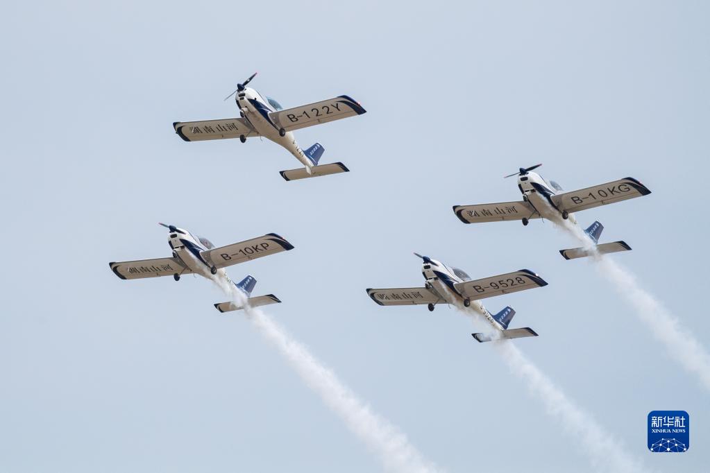 9月1日,在湖南株洲蘆淞機場(chǎng),飛行員進(jìn)行固定翼編隊飛行表演。