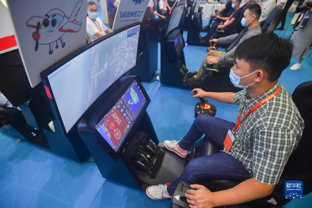 9月1日,在湖南長(cháng)沙國際會(huì )展中心,參觀(guān)者在山河航空展位體驗飛行模擬器。