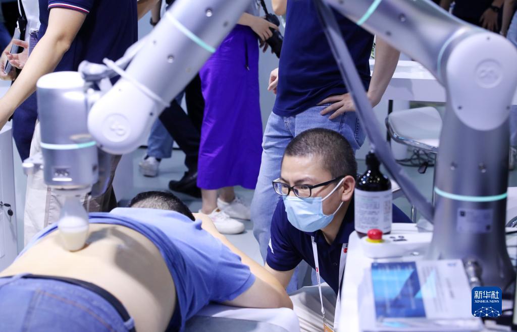 9月1日,工作人員與體驗自適應機器人按摩的參觀(guān)者交談。新華社記者 方喆 攝